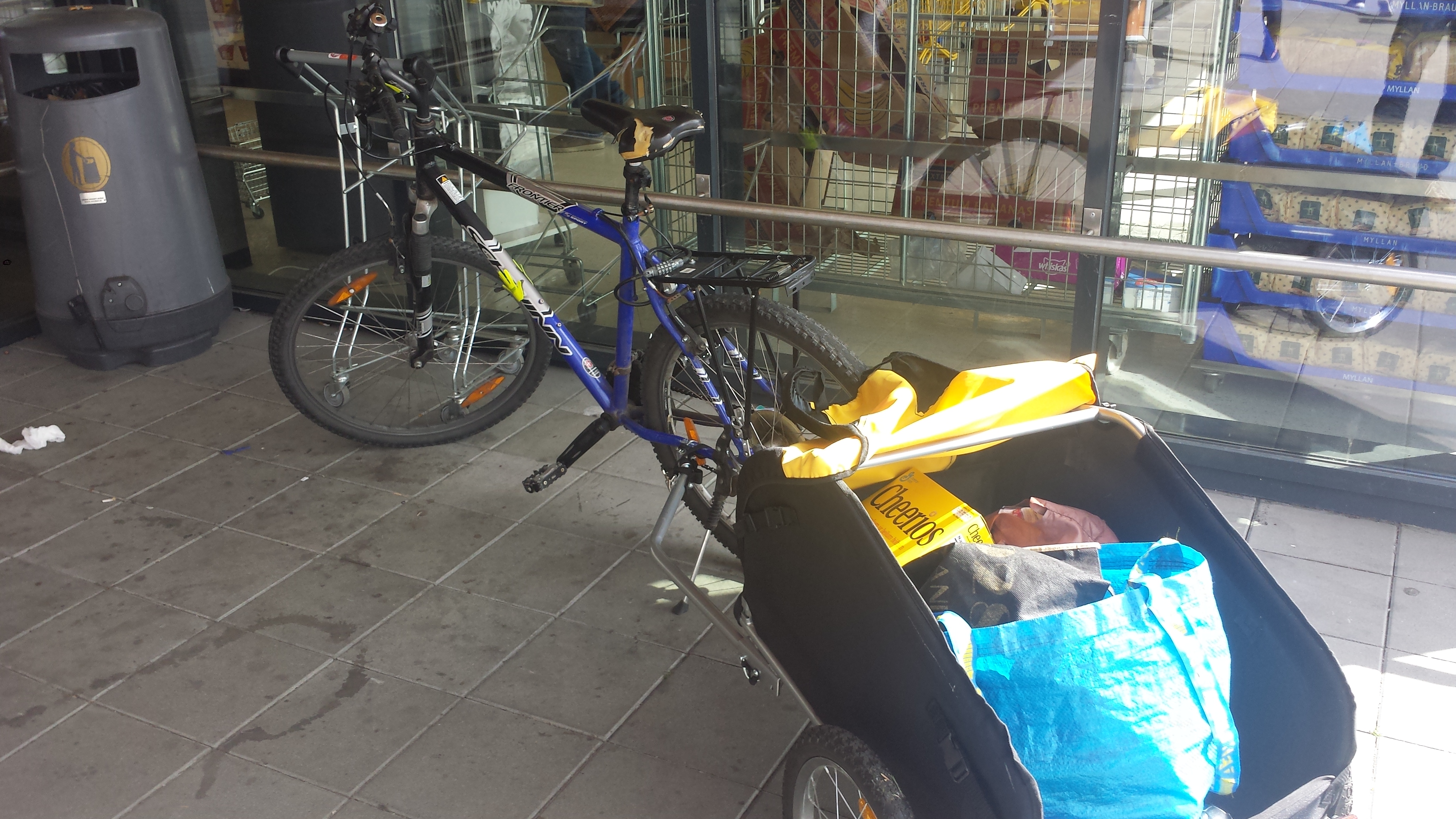 Veistu hvað er miklu svalara en að fara á jeppaskrýmsli í Bónus? Að fara á reiðhjóli. Ekki einu sinni nýju koltrefja keppnishjóli sem annar hver Íslendingur með lífsstílsbólgu á í dag. Bara gömlu draslhjóli. Eitthvað sem afi þinn á í bílskúrnum og er að safna ryki. Eitthvað sem lítur út fyrir að hafa verið framleitt í Sovétríkjunum. Punkturinn er að það þarf bara að koma þér í Bónus en ekki hjálpa þér að sigra Tour de France. Þú þarft þó eitthvað geymslupláss. Það fer eftir fjölskyldustærð. Einstaklingur getur líklega reddað sér með bakpoka og eina eða tvær hliðartöskur. Ég með mína vísitölufjölskyldu (par með tvö börn) redda mér mjög vel með áfastan vagn eins og sést hér: